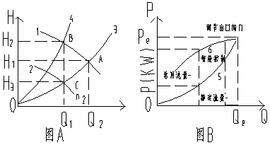 采用恒壓(恒溫)智能控制節(jié)電器,控制水泵運行,是目前供水系統(tǒng)節(jié)能改造的有效途徑之一,圖A和圖B給出了閥門調節(jié)和智能控制節(jié)電器兩種運行狀態(tài)的壓力——流量(H-Q)關系及功率——流量(P——Q)關系。