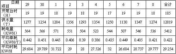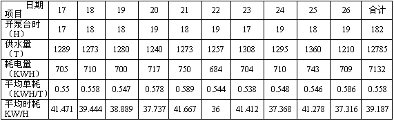 前后相比,10天供水量幾乎相等,而耗電減少1720KWH,平均單耗降低0.136KWH,節(jié)電率24.37%,平均時耗降低9.942KW/H,節(jié)電率25.37%,平均節(jié)電率達24.87%,節(jié)電效果顯著。