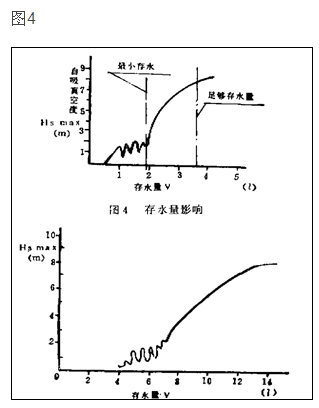 圖5是4TC-80泵存水自吸真空度試驗(yàn)結(jié)果。4TC-80流量:7.8升/秒,泵體存水的容積為l3升,經(jīng)工廠試驗(yàn),達(dá)到足夠存水量的要求。但是這13L是靜止時(shí)加入泵體的存水.在使用中發(fā)現(xiàn),當(dāng)4TC-80的出水段只有0.3m高時(shí),自吸時(shí)水會(huì)沖出來,停機(jī)檢查存水面下降l40mm,存水減少72,這從圖5可以看到,62的動(dòng)態(tài)存水自吸能力是極低的,實(shí)際不能自吸上水。