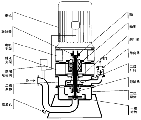 無密封自控自吸泵運行過程中密封裝置不摩擦、無磨損,使用壽命較傳統(tǒng)產(chǎn)品長1 O倍以上。移植真空泵原理自吸性能穩(wěn)定可靠,特別是采用“電動空氣控制閥”真正實現(xiàn)了首次引流,永久自吸,該泵機(jī)組振動小、噪音低、移動靈活、拆裝方便。具有優(yōu)越的自控功能、可與相關(guān)控制系統(tǒng)配套實現(xiàn)高度自動化。■ WFB無密封自控自吸泵結(jié)構(gòu)圖: