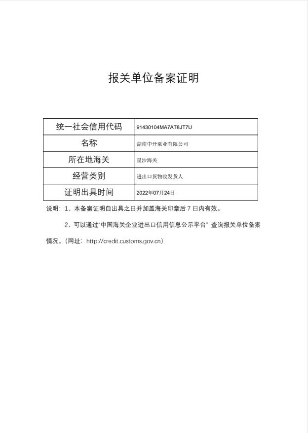 ZB中開泵業(yè)獲得報關(guān)單位備案證明